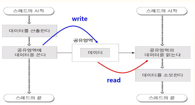 두 thread가 데이터를 교환하는 기본적인 방법은 두 thread 모두 접근 가능한 메모리 영역을 만들어 둔 후, 한 쪽 thread는 그 영역에 데이터를 쓰고, 다른 thread는 데이터를 읽는 방식이다.