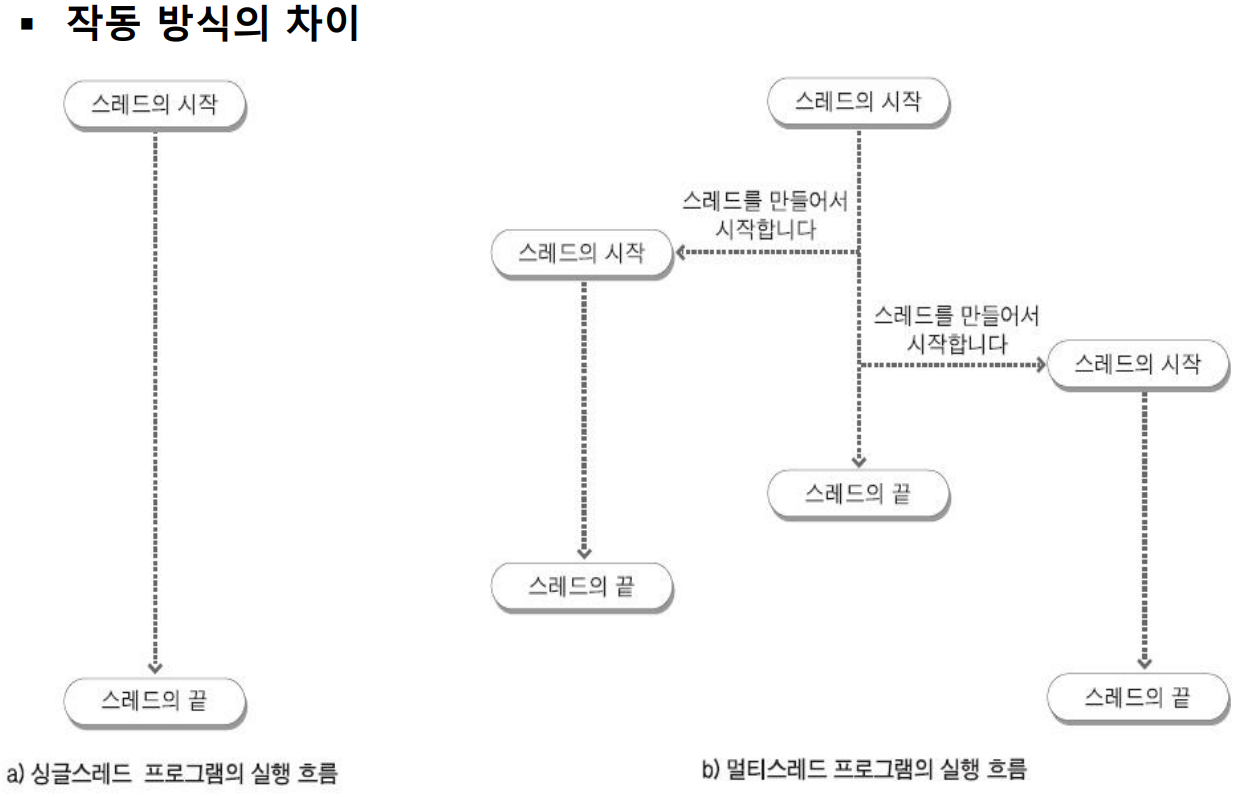 main thread 는 program 이 시작되면 자동으로 시작되지만, 다른 thread 는 main thread 에서 만들어 시작해야 함.