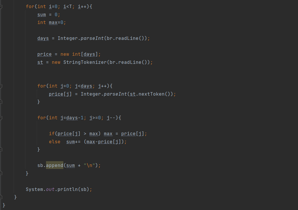 입력의 첫 줄에는 테스트케이스 수를 나타내는 자연수 T가 주어진다. 각 테스트케이스 별로 첫 줄에는 날의 수를 나타내는 자연수 N(2 ≤ N ≤ 1,000,000)이 주어지고, 둘째 줄에는 날 별 주가를 나타