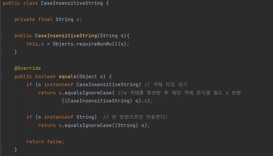 다음 대소문자를 구별하지 않는 문자열을 구현한 클래스에서 equals를 구현한 코드를 살펴보자..
