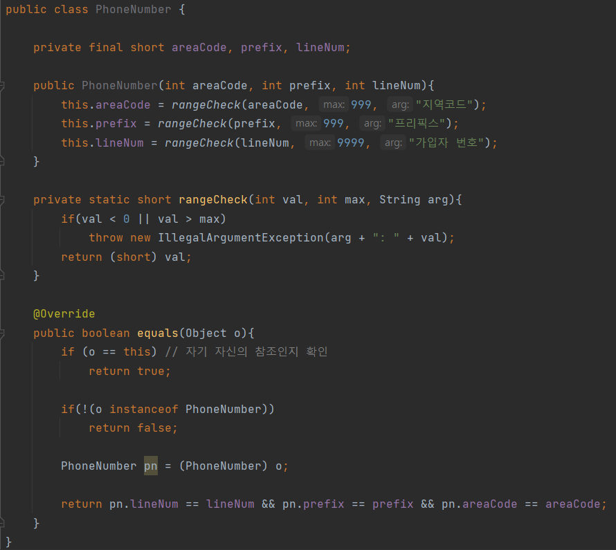 위 규칙을 지켜 전형적인 equals 메서드의 예를 살펴보자
