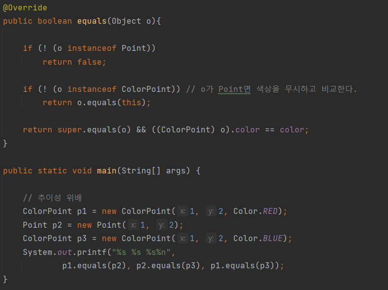 이렇게 Point의 equals 메서드 x, y의 좌표만 가지고 동치성을 확인하는데 ColorPoint는 새로운 필드 color가 추가되었다. 그렇다면 equals 메서드는 어떻게 할까?