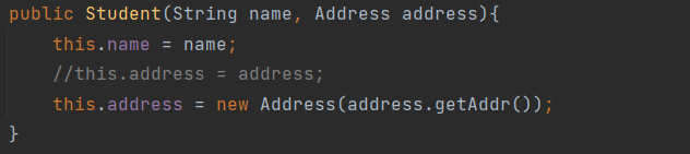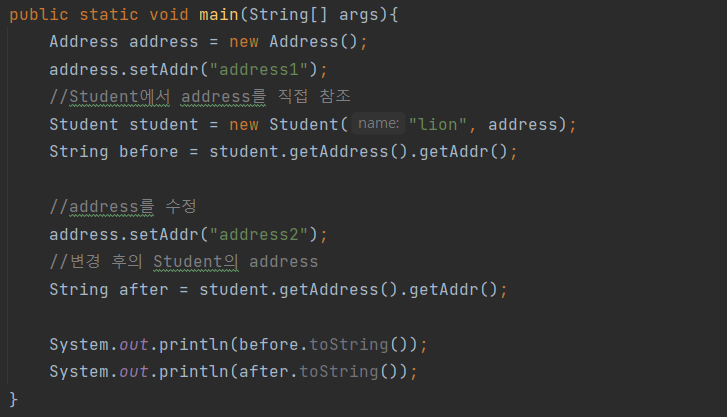 가변 객체 address를 참조하는 필드를 가지는 Student 클래스를 만들어보자.