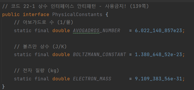 이 상수 인터페이스는 인터페이스를 잘못 사용한 예다.